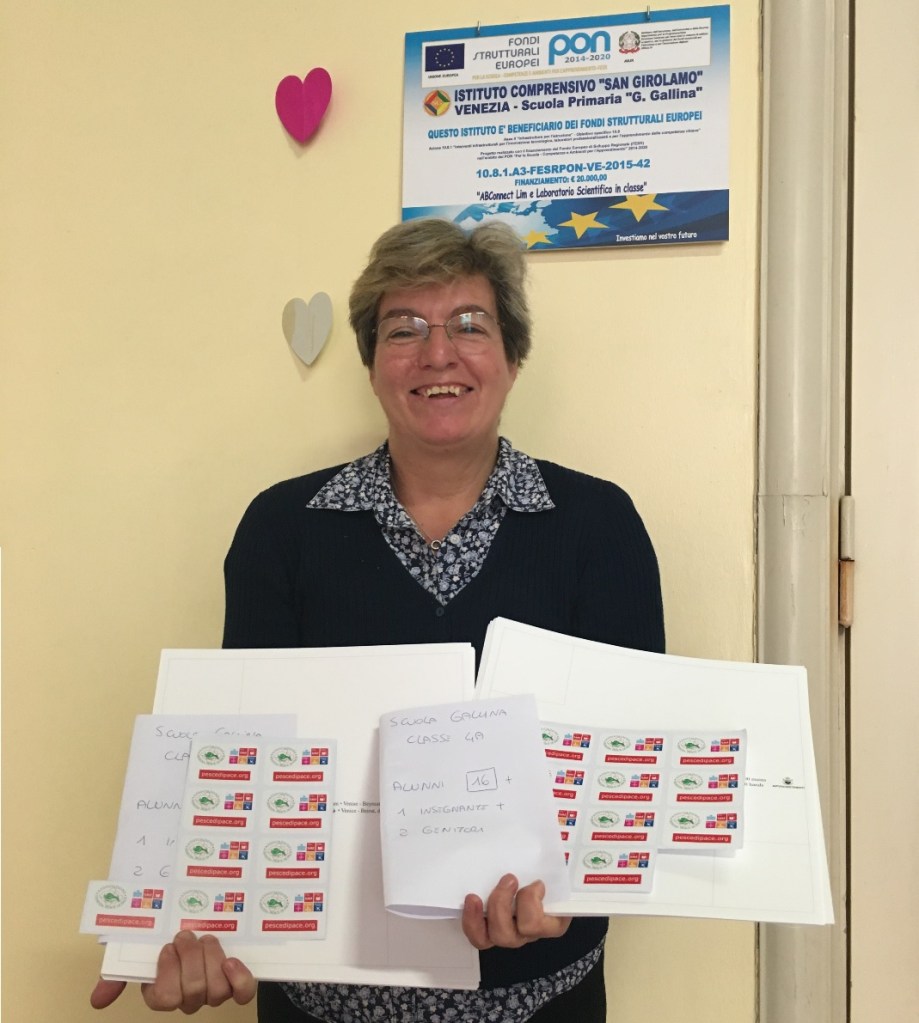 Nel giorno di San Martino, festa speciale in laguna, la sorridente insegnante Francesca Melloni della Scuola Primaria Gallina di Venezia ha ritirato i fogli di carta che poi sono stati consegnati ai bambini delle classi 4A e 4B.