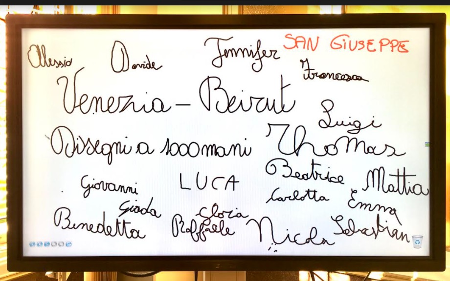 Grande l’entusiasmo dei 19 alunni che hanno ascoltato “Pesce di Pace”, posto domande e spiegato come eseguiranno il loro mezzo disegno. Una bimba ha detto: “Disegnerò la mia città con un ponte che va dritto a Beirut”. Un bimbo ha subito aggiunto: “Questo Progetto mi piace molto, non è solo un disegno, è un impegno per la vita”. Momenti di grande gioia quando i bambini collegandosi con WhatsApp hanno salutato a gran voce la direttrice della scuola di Beirut: “Ciao, siamo i bambini di Venezia”. La solidarietà e l’amicizia non hanno né distanze, né confini. Appeso alla parete della classe un cartellone, sopra un prato roselline, margherite, farfalle multicolori e la scritta: “La scuola ti dà ali per volare”.
