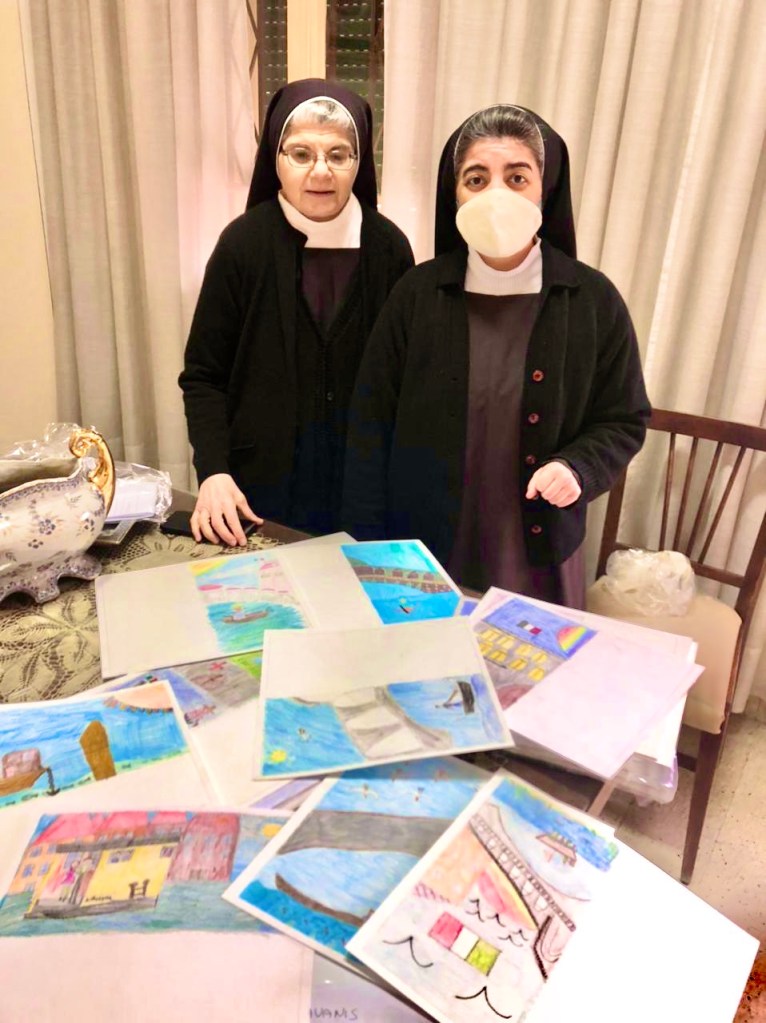 Ecco le foto che immortalano il mitico arrivo. In primo piano Suor Maddalena (con la mascherina), direttrice, e Suor Ghada, responsabile della comunità e supervisore della Scuola, che hanno detto: “Vi informiamo che i disegni colorati dai bambini di Venezia sono appena arrivati. Il vostro progetto educativo è ora anche il nostro. Tutta la comunità è felice di portarlo avanti fino in fondo con la stessa passione con la quale, tu Nadia, lo stai seguendo. Quello che interessa ai nostri ragazzi è l’amicizia, la fratellanza e questo Libano che potrà vedere uno spiraglio di speranza e di luce”.