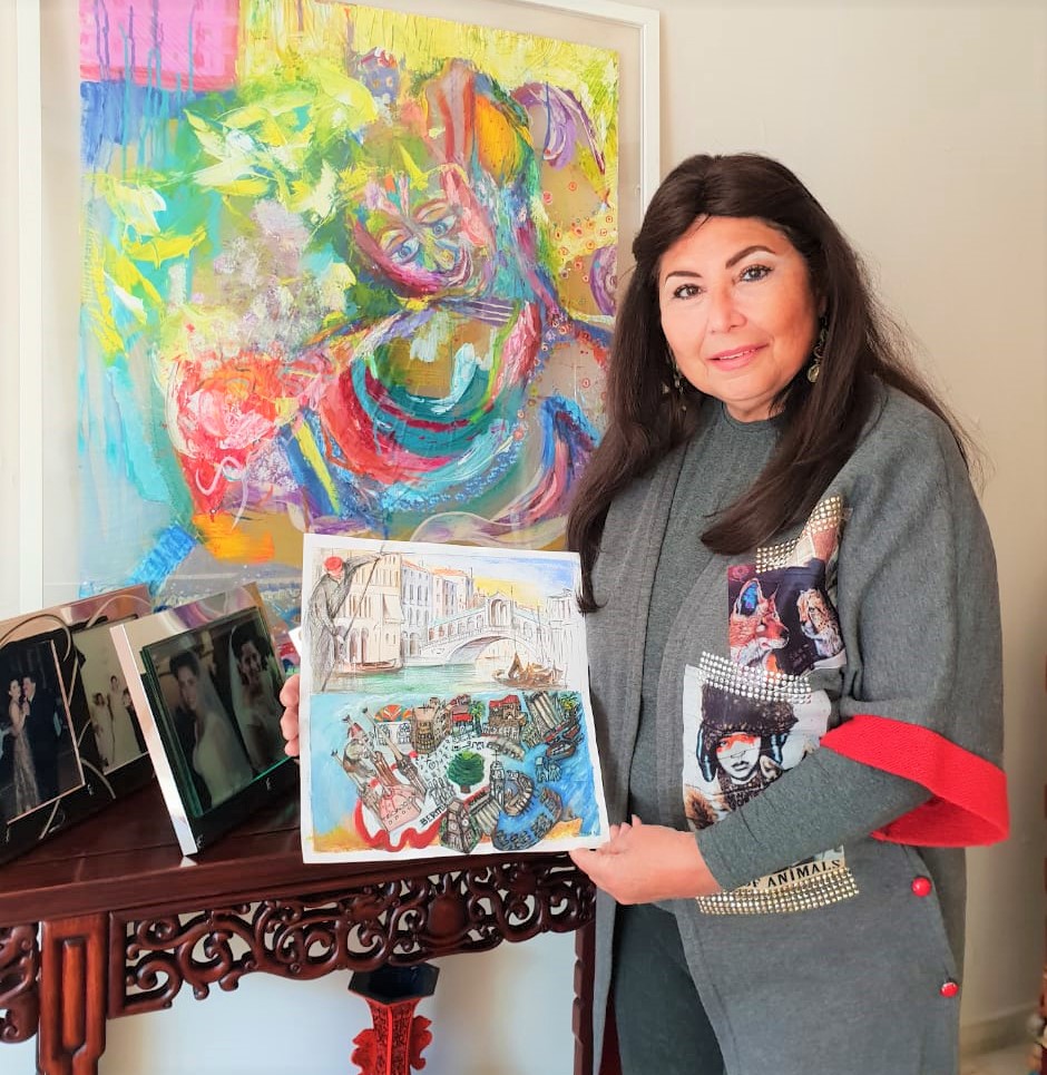 Nel dipinto parlano l’arte, l’architettura, la storia di Beirut e di Venezia. Da una parte l’artista libanese Leila Kanso ha disegnato una straordinaria mappa di Beirut multicolorata e dettagliata, nell’altra l’artista italiana Carla Erizzo ha rappresentato la sua città, Venezia con il ponte di Rialto e il gondoliere.