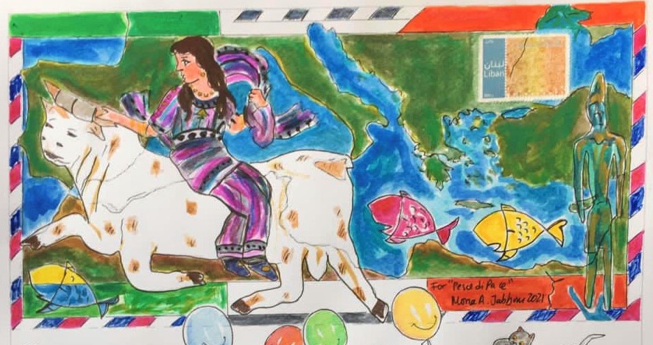 Nel dipinto un grande spazio è dedicato al mar Mediterraneo dove un tempo navigava l’antico popolo fenicio. La particolare spiegazione arriva dall’artista Mona Jabbour nata nel Paese dei Cedri: “A scuola da piccola era mio stile fare dipinti di poesie”. Qui per continuare lo scambio con l’artista veneziano ha scelto il tema della mitologia, quello dell’Europa che era una principessa fenicia.