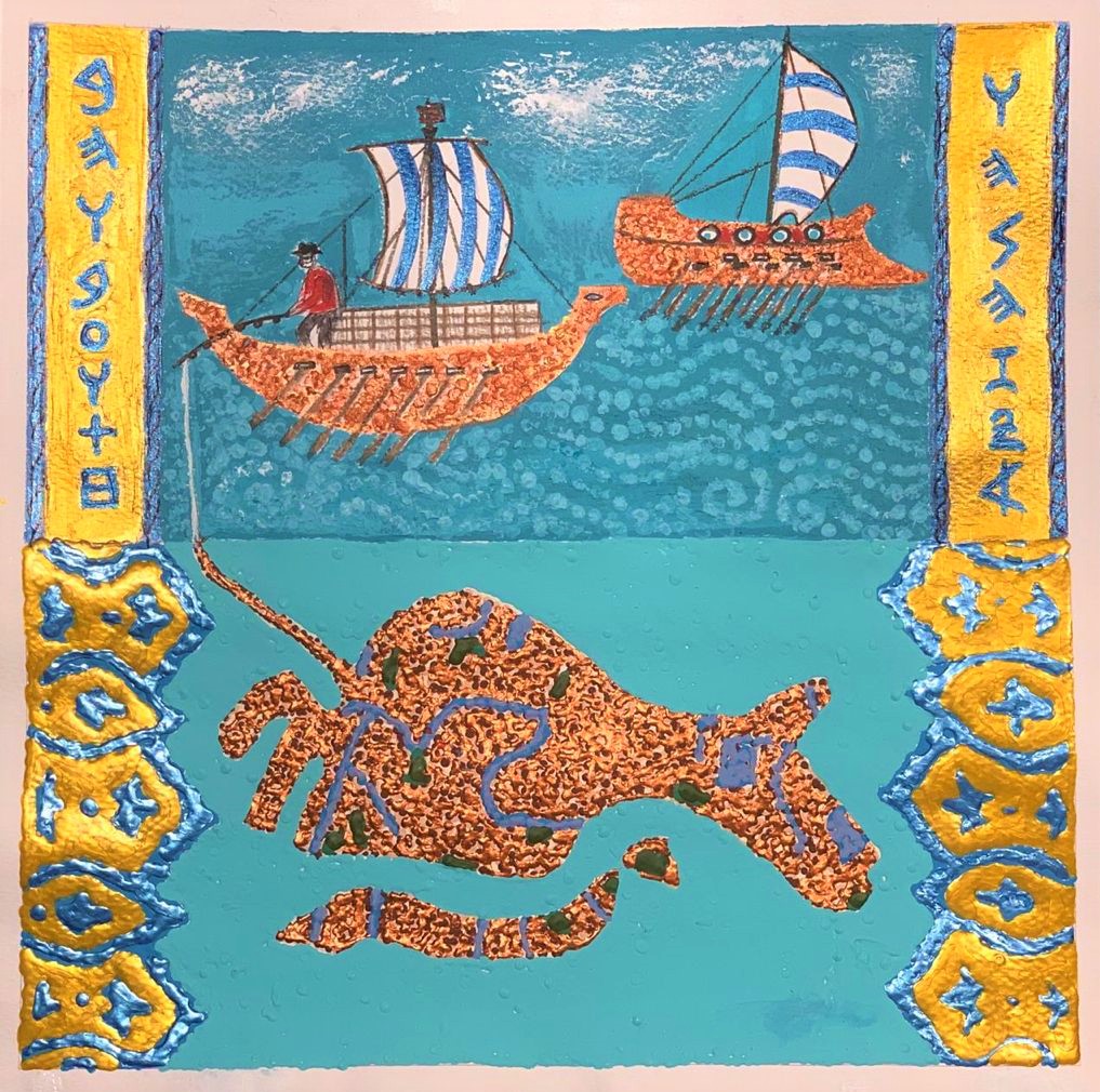 Nel dipinto dei due artisti si ritrova anche il viaggio, che è meraviglia, scoperta, emozione che prende la forma di due navi fenicie e dell’antica mappa di Venezia. L’artista Mona Kabbani Khater ha inserito anche un pescatore. Non c’è niente di più bello dell’attesa. L’uomo viaggia e pesca. Il tempo scorre, lui sperimenta e trova… un tesoro. Trova Venezia che quest’anno celebra i 1600 anni dalla sua fondazione.