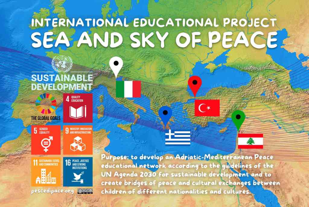 “Mare e cielo di pace” è un progetto biennale 2022/24 che coinvolge oltre 1000 bambini delle scuole elementari di 4 Paesi (Italia, Libano, Grecia, Turchia) e di 4 città: Venezia, Beirut, Istanbul e Messini/Petalidi.