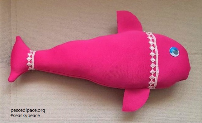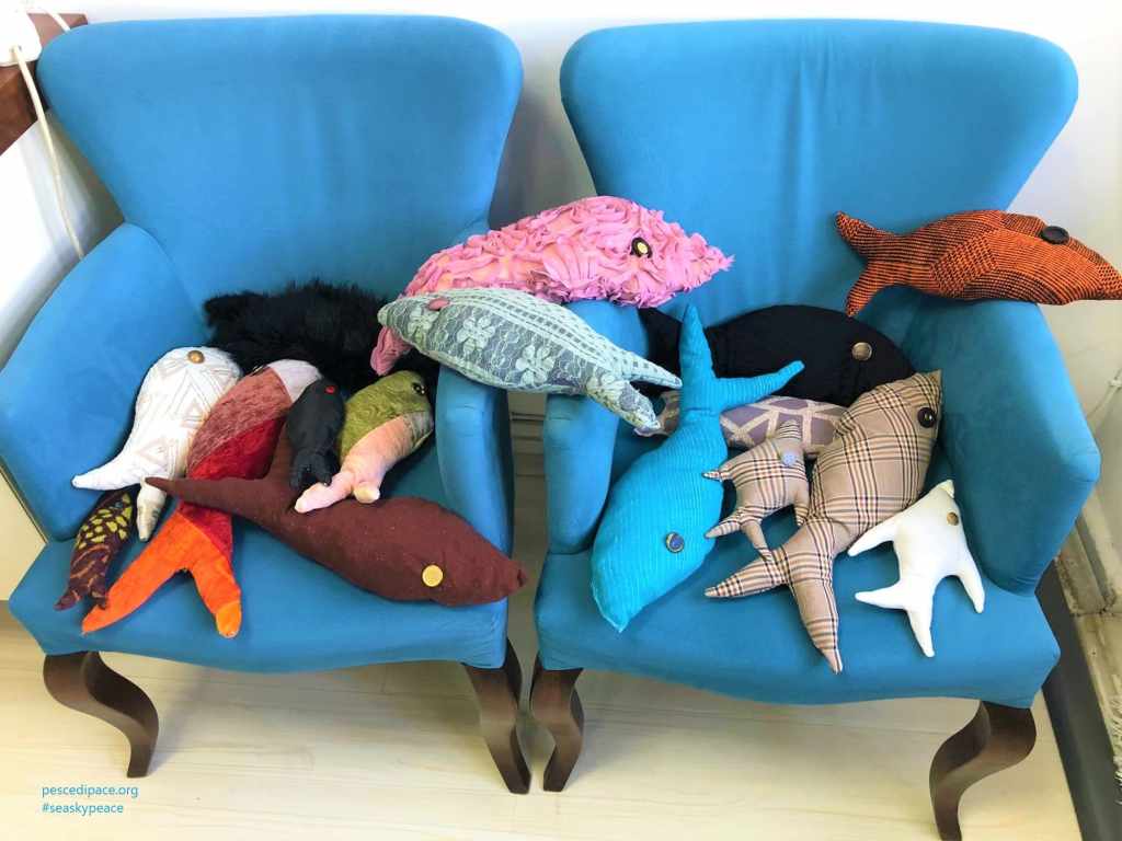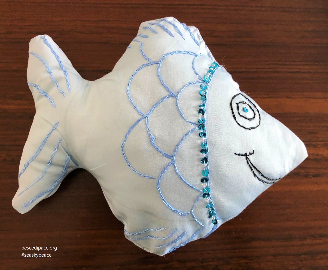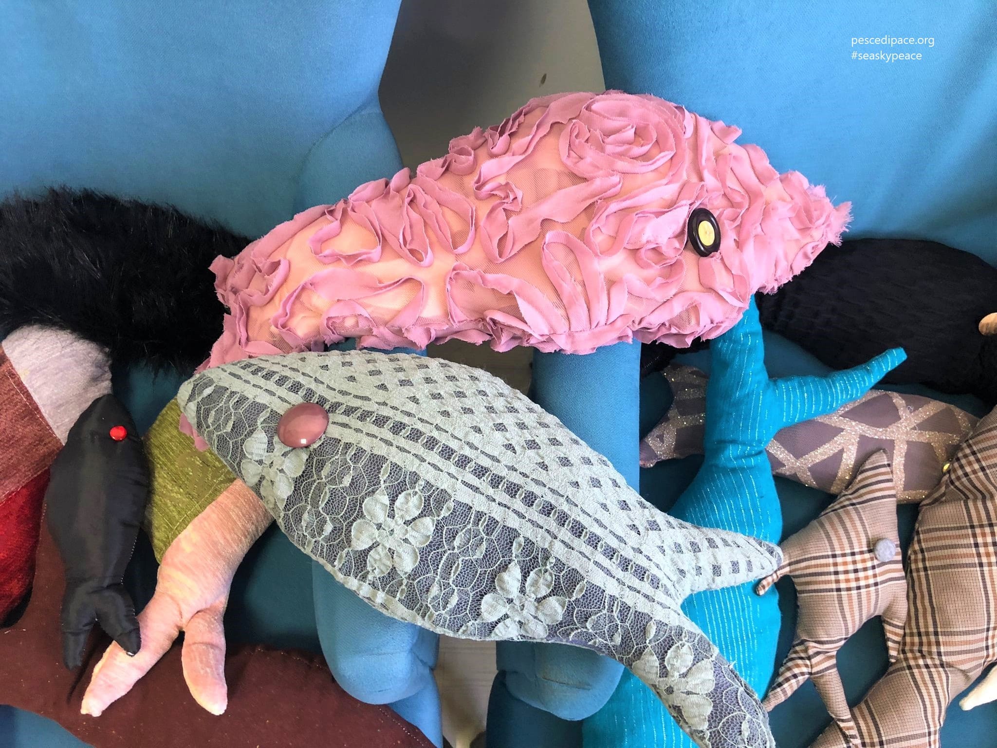 Pesci di differenti forme e colori, blu, azzurri, rosa, rossi. Abbelliti con deliziose passamanerie e perline sono stati confezionati in tessuto utilizzando materiali di scarto o riciclati per educare allo sviluppo sostenibile.
